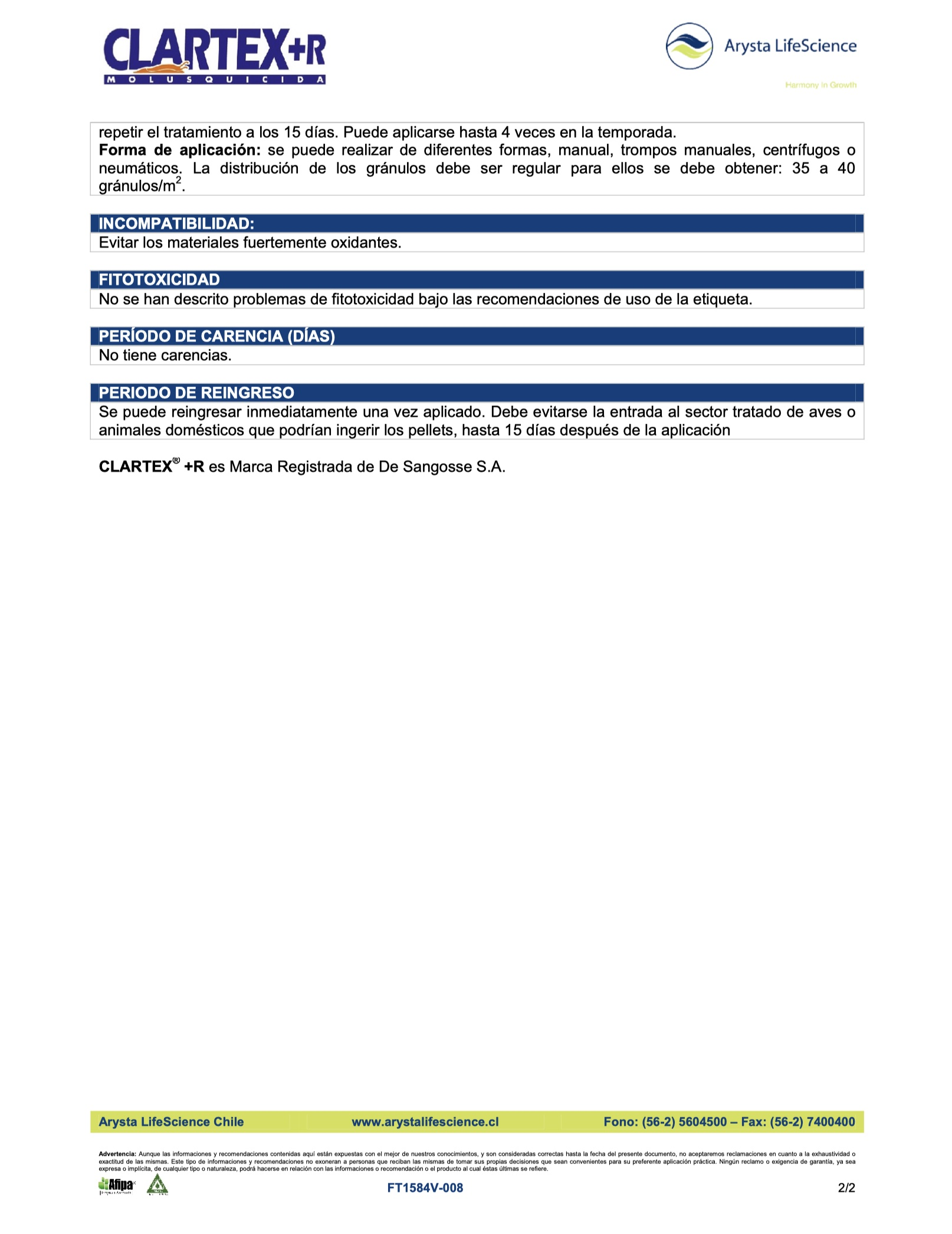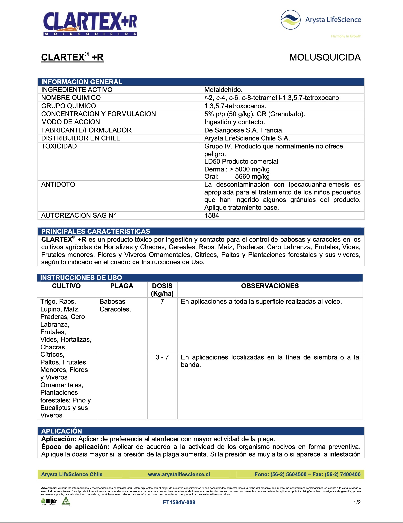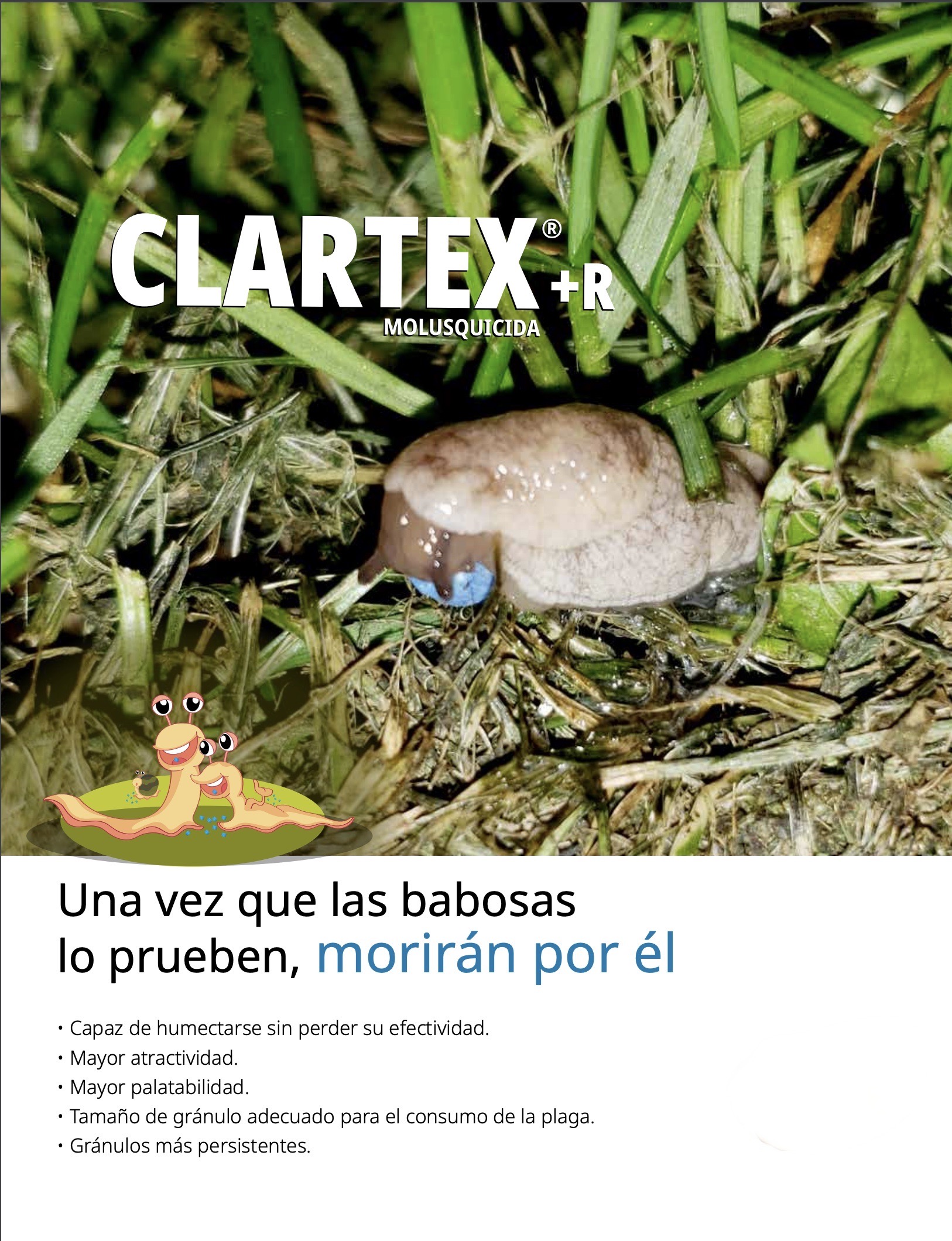 Clartex +R . Es un producto tóxico y actua por contacto e ingestión para el control de babosas y caracoles en los cultivos agrícolas de: Hortalizas , Flores, Ornamentales en viveros y Chacras, también en cultivos mayores.