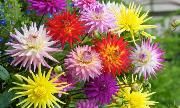 Las dalias cactus ofrecen un espectáculo impresionante, con flores curvas y puntiagudas en una gama de colores brillantes. Su forma de estrella las hace resistentes a las inclemencias del tiempo, ya que son menos propensas a verse afectadas por las fuertes lluvias o al viento que otras variedades de dalias. Son fáciles de cultivar a partir de semillas y son excelentes flores de corte. Para obtener mejores resultados, cultívelas a pleno sol en un suelo húmedo pero bien drenado, y recoja los tubérculos en noviembre para que pasen el invierno del año siguiente.