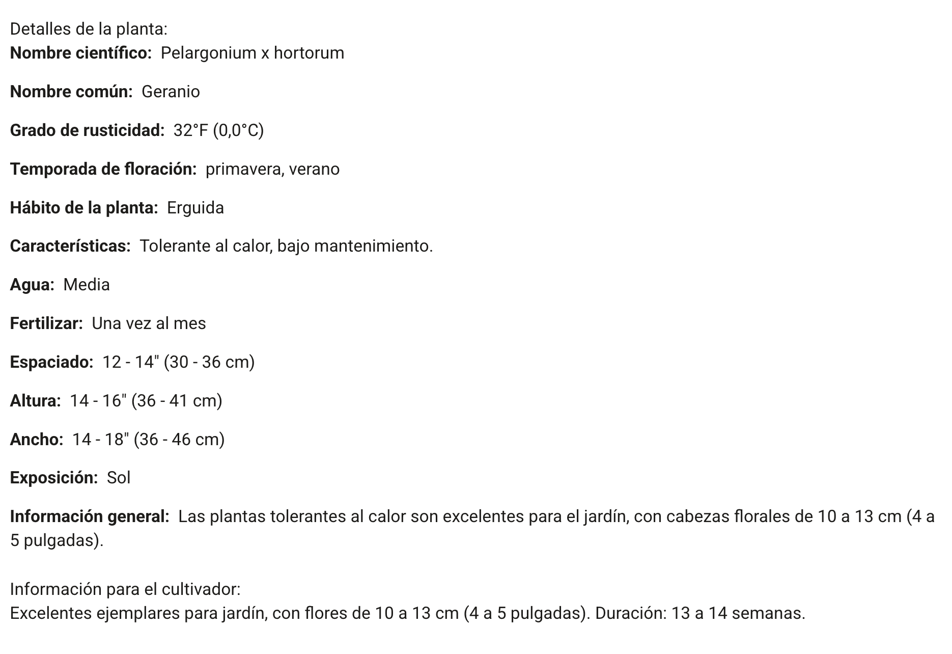 Cultivo de geranio: Pleno sol o semisombra. Riego regular. Las flores atraen a los colibríes, las plantas toleran bien el calor y resisten a conejos y ciervos.