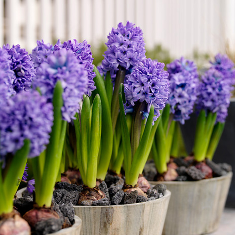 Dulcemente fragante con un delicado y fresco aroma, cada bulbo de jacinto produce 4-6 hojas angostas y verticales y 1-3 espigas de flores fragantes en forma de estrella en colores azul, lavanda, naranja, melocotón, rojo, rosa, amarillo y blanco.