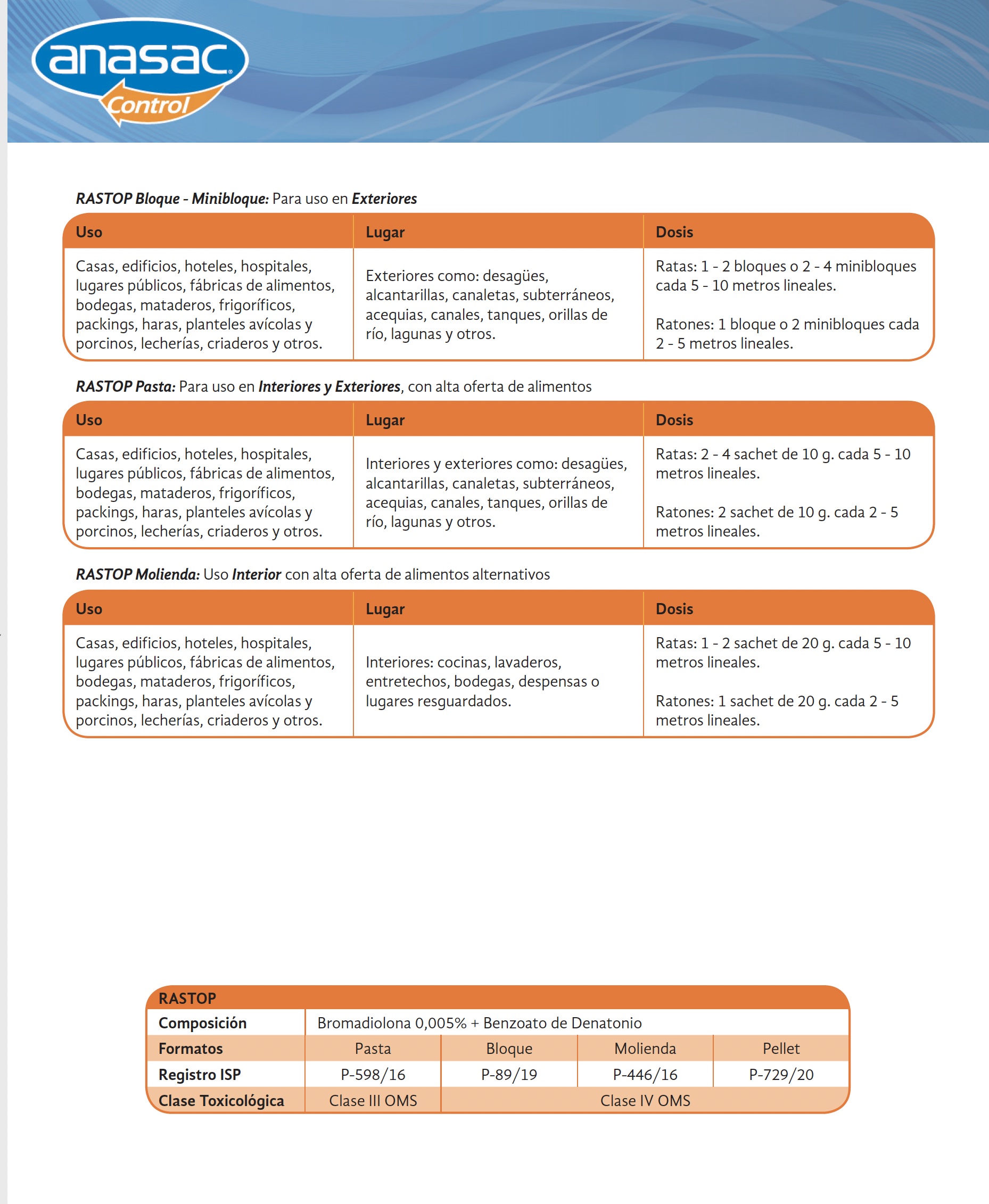 Rastop es un raticida de última generación, mata todo tipo de ratas y ratones, al consumir su dosis letal en una sola ingesta, incluso a aquellos roedores resistentes a otros anticoagulantes convencionales. Mata a los roedores en pocos días, sin producir rechazos en la colonia. Posee una formula muy apetecida por los roedores, debido a su atractivo olor, sabor y textura.