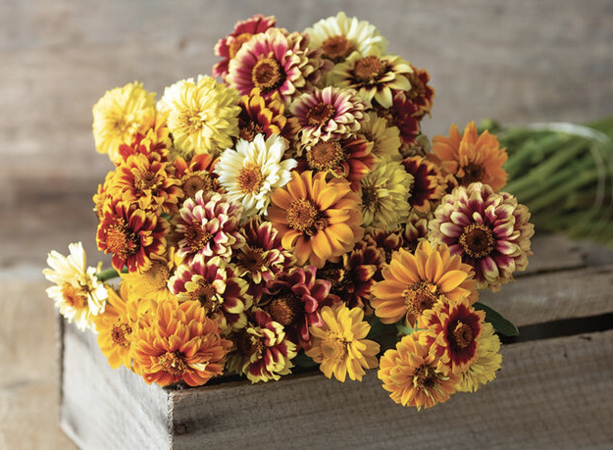Una variedad vintage, tan apreciada hoy en día por sus abundantes flores de pétalos puntiagudos superpuestos en cobre bruñido con puntas doradas. Fácil de cultivar, basta con sembrarla al aire libre después de que la tierra se haya calentado. Recójala con frecuencia y llénela en jarrones de barro para crear ramos sencillos. Premio All-America Selections en 1962.